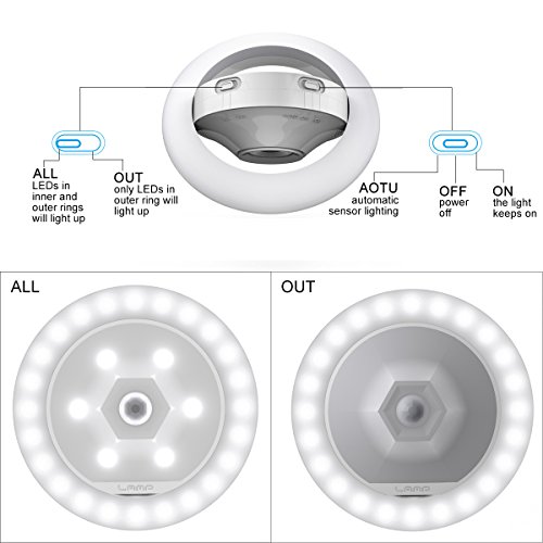 Solid Light & 2 Brightness Level – you can switch to solid light mode, using it as a constant night light; Dual light rings, the LEDs in inner ring can be turn on/off for brighter/darker emitting area.