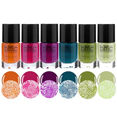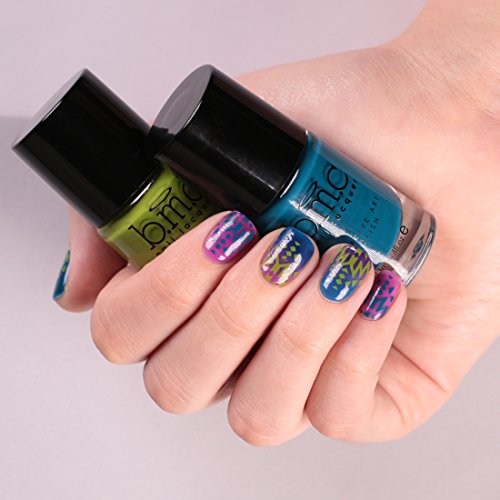 Tropix collection includes 6 heavily-pigmented creative art nail stamping polishes to help you dive into that summer mood! These high energy tones perfectly embody the vibrance and warmth of our dream tropical vacay. Each rich creamy color will transfer beautifully from your stamping plate to your nails. Snag the entire Tropix Collection in our 6-piece master set or pick your favorite fresh hues individually. Colors include: Marmalade (B214) - a warm orange, Fuchsia Flame (B215) - a juicy magenta, Shadow Chaser (B216) - dark purple, Teardrop (B217) - deep turquoise, Limelight (B218) - fresh grass green, and Soft Sage (B219) - soft green. BMC stamping polish is 5-free! We want you to look beautiful and stay beautiful, so our nail stamping polishes are made without 5 of the most common toxic chemicals found in most nail polishes. *WARNINGS*: Keep away from open flames. Adult supervision for ages 6 and under. *INGREDIENTS*: Butyl Acetate, Ethyl Acetate, Nitrocellulose, Isopropyl Alcohol, Ethanol, Polyacrylic Acid, Acetyl Tributyl Citrate, Stearalkonium Hectorite.Feature