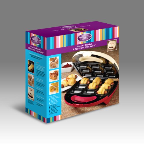 With the Nostalgia Electrics PNB-900 Pigs in a Blanket & Appetizer Bites Maker everyone's favorite party snacks and appetizers are quick and easy to make! This unit cooks up to nine classic Pigs in a Blanket in just 5-8 minutes. Your Pigs in a Blanket & Appetizer Bites Maker makes great pretzel bites, cocktail sausages, Jalepeño poppers, potato skins, corndog bites and more!. Use your imagination!Feature