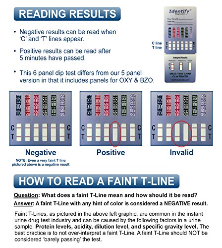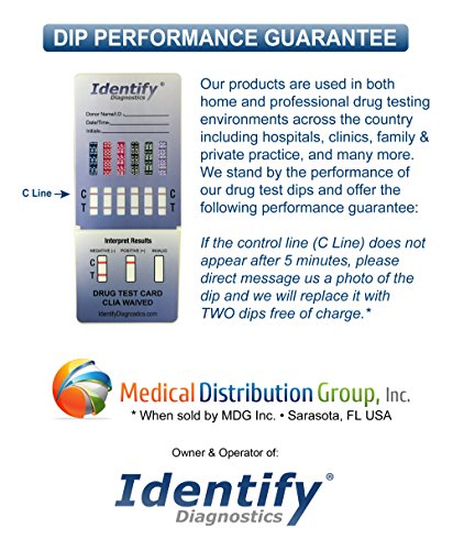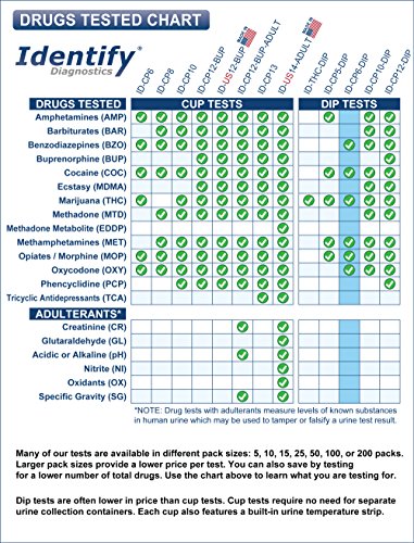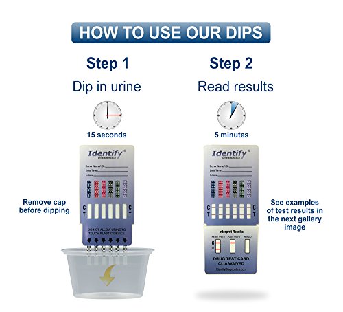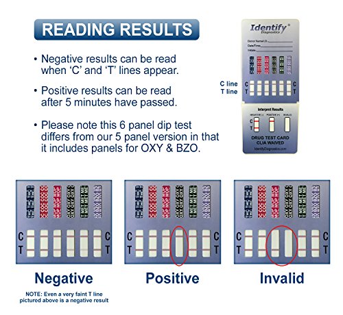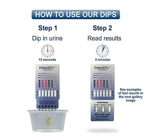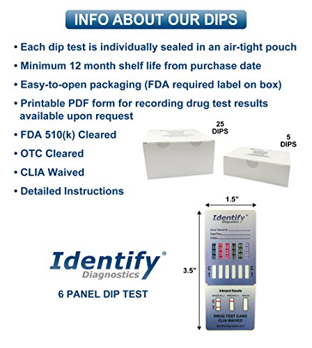Studio : Identify Diagnostics Publisher : Identify Diagnostics Binding : Health and Beauty Product Description Identify Diagnostics 6 Panel Drug Test Dip with Low Opiates Cutoff - Testing Instantly for 6 Different Drugs. Model # ID-CP6-DIP. Available in packs of 5, 10, 15, 25, or 50 dips. Buy more and save more. The current expiration date for this drug test dip is on or better than: FEBRUARY 28, 2019 Identify® Diagnostics drug test dips were created with quality, accuracy, price as key features. This drug test kit has a low cut-off level of 300 ng/mL for Opiates / Morphine (MOP). Many other dips have an opiate cut-off level of 2,000 ng/mL. This 6 panel dip test is one of several available versions trusted by medical professionals home drug testers across the United States. ?These urine screening dip tests are FDA 510(k) Cleared, CLIA Waived, and Over The Counter (OTC) Cleared by the USA FDA having been held to a higher quality standard than non OTC cleared products. They also meet the SAMHSA standard for substance abuse urinalysis. This 6 panel drug test dip detects the following drugs at the below FDA recommended cutoff levels in human urine: THC - Marijuana 50 ng/mL COC - Cocaine 300 ng/mL MOP - Opiates / Morphine 300 ng/mL (Six times lower than many other brands) OXY - Oxycodone 100 ng/mL MET - Methamphetamines 1000 ng/mL BZO - Benzodiazepines 300 ng/mL Please view the image gallery on this page featuring images designed to help understand how to use the drug tests, read results, and other useful product info. Other features of Identify Diagnostics drug test dips: - Each dip test is individually sealed in an air-tight pouch - Minimum 12 month shelf life from purchase date - Discrete easy-to-open packaging (FDA required label) 0