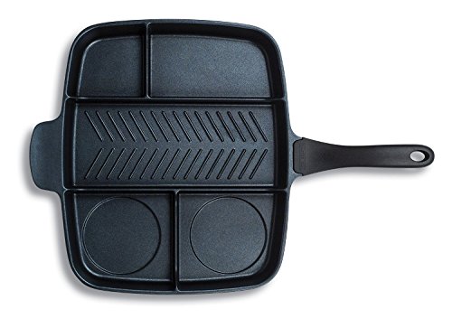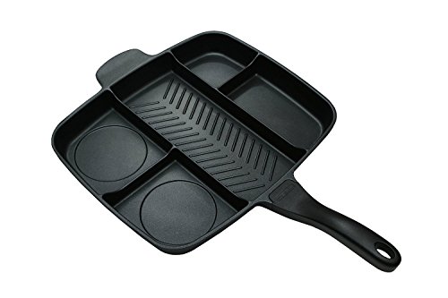 Studio : MasterPan Publisher : MasterPan Binding : Kitchen Product Description Why use 5 pans to make a great meal when you only need one? Cook up to five different foods all at once on one burner with the Master Pan! Prepare a complete breakfast, big burger meal, full fajitas, or a healthy salmon dinner with veggies. The possible food combinations are endless! Plus, when you're finished you'll have just one pan to clean. Cook faster, clean less, and still enjoy great meals! - Multi-sectional design - cook 5 foods at once! - 100% die cast aluminum, energy efficient base - Heavy gauge bottom distributes heat flow evenly - Double layer of Whitford's XYLAN PLUS coating - Easy to clean, stain resistant, dishwasher safe - 15-20% hotter in center section for grilling meats - Safe non-stick, PTFE, No PFOAs or Heavy Metals - Bakelite handle is oven safe to 350 Degree F for 1 hour. 0