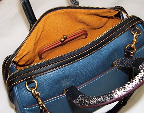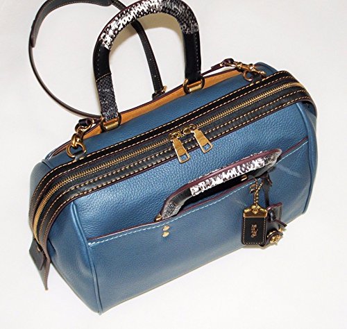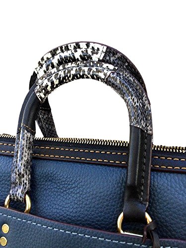 -. Brand : -. Color : Dark Denim / Gold -. Department : womens -. EAN : 0889532748839 -. Feature : Done in glovetanned pebble leather with genuine snake handles, from the 1941 Collection / The zip closure opens to reveal an interior that's fully lined in suede with zip and French purse pockets / Genuine Python leather handles have an approximate drop of 4 1/2" and a long, adjustable and removable strap for shoulder or crossbody wear / Measures approximately: 11 1/2" (L) x 7 3/4" (H) x 6 1/2" (W) -. ProductGroup : Shoes -. ProductTypeName : HANDBAG -. Size : Large -. Title : Glovetanned Pebble Leather Snakeskin Handle Rogue Satchel in Dark Denim / Old Brass 58690 -. UPC : 889532748839