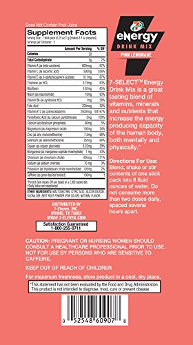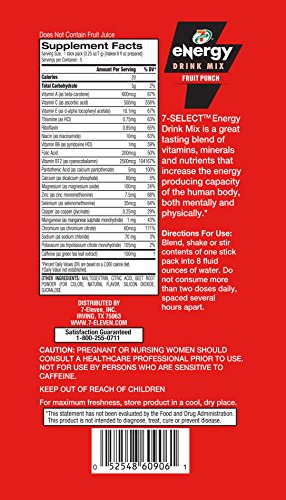 -. Binding : Health and Beauty -. Brand : 7-Eleven -. Feature : 7-SELECT Energy Drink Mix is a great tasting blend of 19 vitamins, minerals and nutrients / Increases the energy producing capacity of the human body, both mentally and physically / Only 20 calories, gluten and sugar free / Great tasting fruit flavors / Natural caffeine from green tea leaf extract -. IsAdultProduct : 0 -. Label : 7-Eleven -. Manufacturer : 7-Eleven -. MPN : 7SEDM65PRNT -. PartNumber : 7SEDM65PRNT -. ProductGroup : Health and Beauty -. ProductTypeName : HEALTH_PERSONAL_CARE -. Publisher : 7-Eleven -. Studio : 7-Eleven -. Title : 7-Select Energy Drink Mix, 6 resealable - 5 pack bags