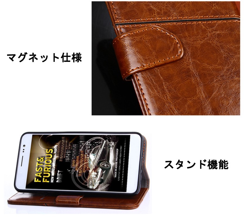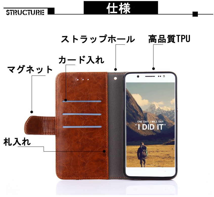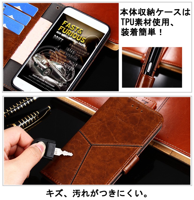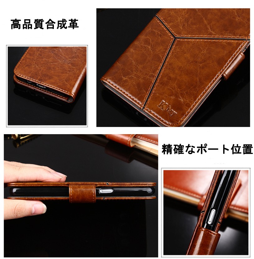 高品質手帳型レザーケース!合成革仕様、光沢素材を施してあり、高級感が漂う!ストラップホール付き!カード3枚収納、スタンド機能など搭載!本体収納ケースは柔軟性のあるTPU使用、装着簡単!