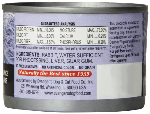 A Closer Look: Evanger's Grain Free Rabbit is made with rabbit meat and other natural ingredients. The diet is totally grain free and is suitable for dogs that have food allergies. This diet is full of proteins, vitamins and minerals that can help maintain overall health.