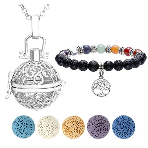 Top Plaza Aromatherapy Essential Oil Diffuser Necklace Silver Flower Locket Pendant With 5 Dyed Lava Stones & Tree of Life Lava Stone Chakra Bracelet