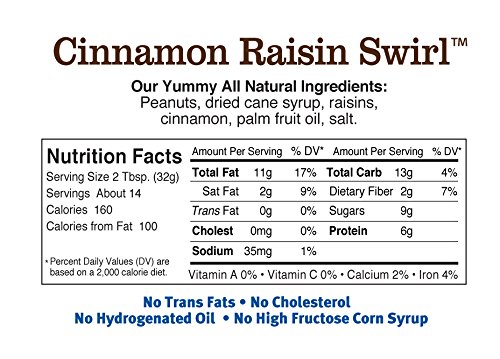 ReleaseDate : 2008-09-26 Studio : Peanut Butter Co. Publisher : Peanut Butter Co. Binding : Grocery Product Description Peanut Butter Co. Cinnamon Raisin Swirl is peanut butter blended with cinnamon and raisins. It's like spreading your peanut butter on cinnamon raisin bread?without the bread. It's like spreading your peanut butter on cinnamon raisin bread without the bread. It's delicious on apples, bagels or straight from the jar! It contains no cholesterol, no trans fats, no hydrogenated oils, and no high-fructose corn syrup. It is also gluten-free, Non-GMO verified, certified vegan, and certified kosher pareve by the Orthodox Union. The shelf life is 6 months after opening, if stored in a cool, dry place. 6 grams of Protein per serving. 0
