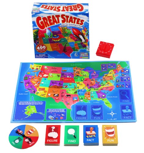 -. Feature : Fun and educational / Performance and quality tested / Great fun for children of all ages / 400 questions - fact, find figure, and fun! All about the United States of America! / Game includes game board, 100 Fact cards, 100 Find cards, 100 Fun cards, spinner, timer and instructions. / All about the United States of America! / Play the game right on the map of the USA / For 2-6 players