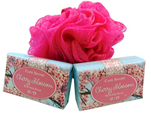 Bath Pouf Sponge & Cherry Blossom Soap Set with Mesh Bag Gift Set