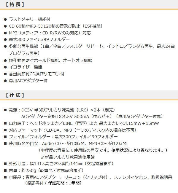 ラストメモリー機能付きポータブルCDプレーヤー。