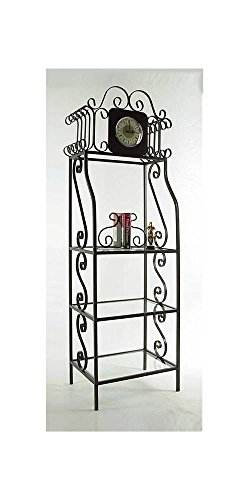 Studio : Grace Collection Publisher : Grace Collection Product Description Quartz movement clock. Three tempered safety glass 18 in. deep shelves. Made from wrought iron. Made in USA. Space between clock and first shelf: 23.5 in.. Spacing between shelves: 14 in.. Distance between floor and bottom shelf: 6 in.. Distance from floor to middle shelf: 22 in.. Distance from floor to upper middle shelf: 36 in.. Inside: 22.5 in. W x 18 in. D. Overall: 24 in. W x 18 in. D x 78 in. H (113 lbs.). Affords additional display space for decorative accessories or other small items. The detailed scroll work adds a nice flair to this functional rack. 0