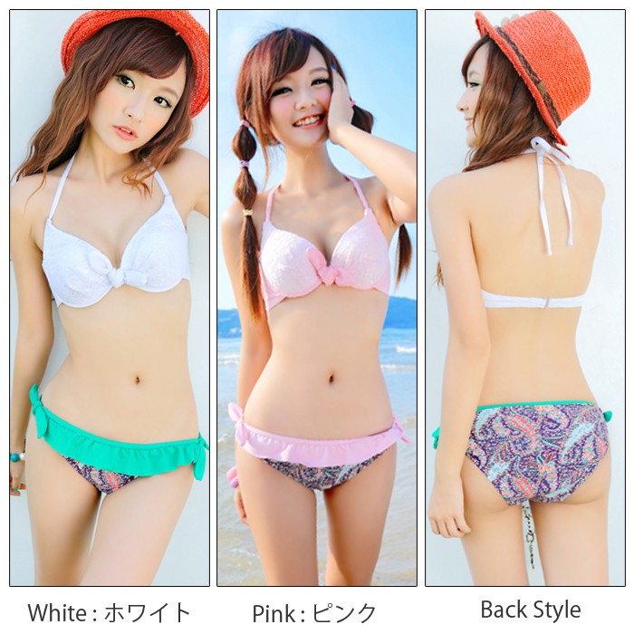 | 商品説明 | 胸元リボン、ペイズリー柄がとっても大人かわいい♪ ビキニ2点セット! 夏らしいカラーで、楽しいビーチタイムが過ごせる水着です☆ もちろんワイヤー入りブラでバストアップ効果♪ ※輸送上の都合により、多少の汚れ・シミなどが見られる場合がございます。 また、発送上の状態によって商品がシワになる場合がございます。予めご了承くださいませ。 |