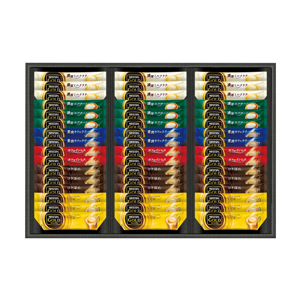 ●ゴールドブレンド濃厚ミルクラテ7g・ゴールドブレンド濃厚カプチーノ7g・ゴールドブレンド6.6g・ゴールドブレンドコク深め6.6g×各9、ゴールドブレンドカフェインレス6.6g・ゴールドブレンド豊潤カフェラテ8.3g×各6