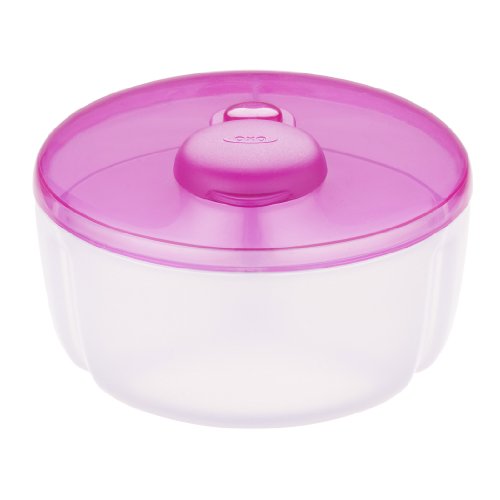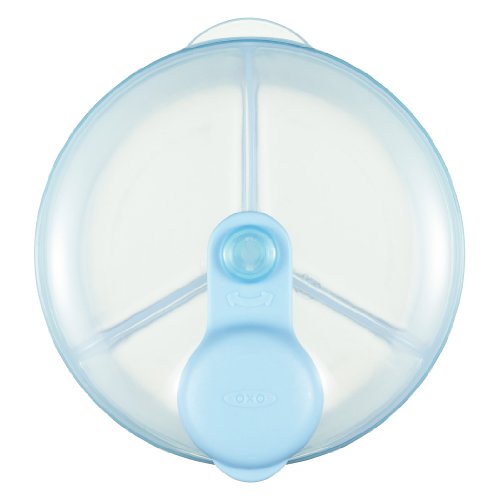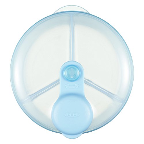 Whether you're gone for a few hours or a full day, make feeding away from home a breeze with the OXO Tot Formula Dispenser. This compact dispenser has three compartments that each hold enough powdered formula for a 9 ounce bottle. When it's feeding time for baby, simply turn the lid until it clicks into the desired compartment and lift the cap. The cap conveniently swivels and stays out of the way for one handed pouring. The clear body has indents for comfortable handling and allows you to easily see which compartments are full. The compact shape makes it easy to store in your diaper bag. Rounded corners on the inside of the dispenser ensure all the formula easily pours out no more powder stuck in crevices. When your little one gets too big for bottles, the dispenser can also hold oatmeal, rice cereal or snacks for munching on the go.