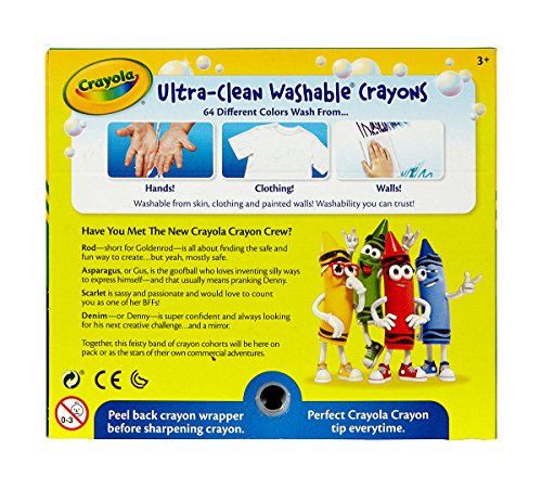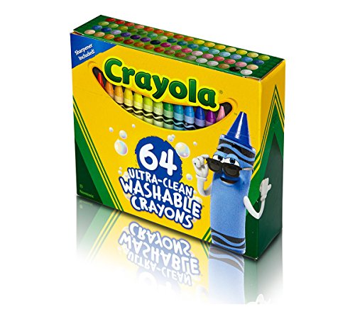 Take the worry out of coloring time with Crayola Ultra-Clean Washable Crayons. These crayons easily wash off most surfaces, including walls and tabletops, with only a damp sponge and water. Designed for young children who are just learning to color and draw, Crayola Ultra-Clean Washable Crayons are specially formulated for smoother, easier laydown and come in 64 vibrant colors to inspire their imaginations. Ideal for children aged three years and older, Crayola Ultra-Clean washable art tools are great for everyday creative activities at home or in school.Feature