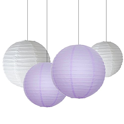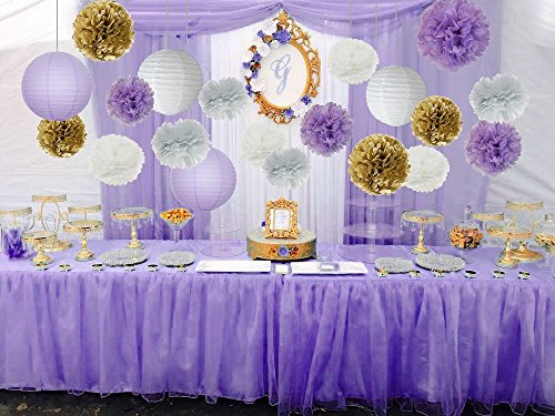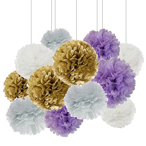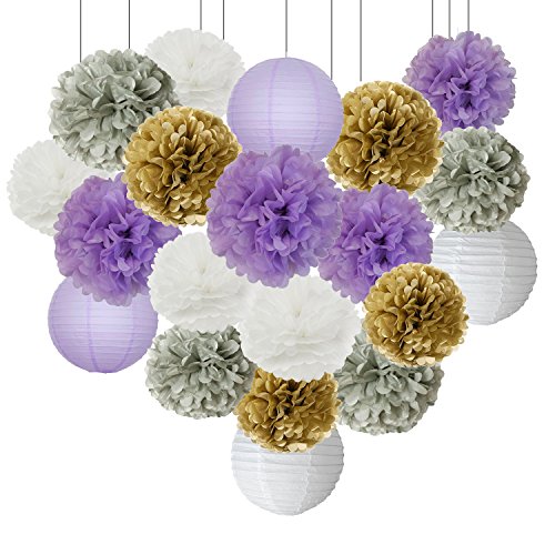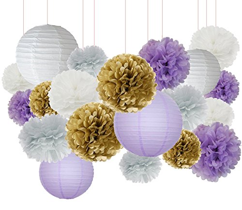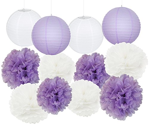 Studio : Furuix Publisher : Furuix Binding : Kitchen Product Description Pack list: 4 pcs 10inch paper lantern,2*white(2*10 inch) 2*lavender(2*10 inch) ;12pcs tissue pom poms:10inch:2*white 2*lavender 2* gold;. 8inch:2*white 2*lavender 2* gold; A mixture of small and large paper lanterns and spiked tissue paper pom poms to inject bright and warm colour and prettiness to your wedding,party or baby shower etc.