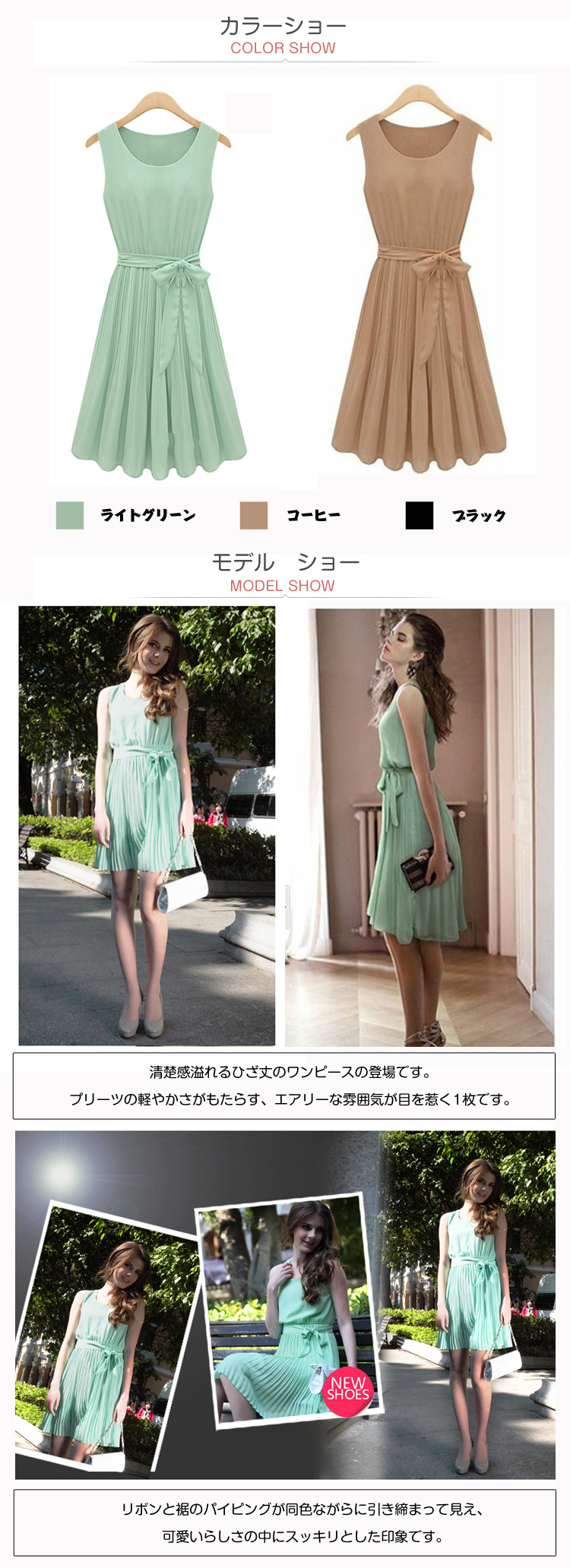 | 清楚感溢れるひざ丈のワンピースの登場です。プリーツの軽やかさがもたらす、エアリーな雰囲気が目を惹く1枚です。リボンと裾のパイピングが同色ながらに引き締まって見え、可愛いらしさの中にスッキリとした印象です。 | |