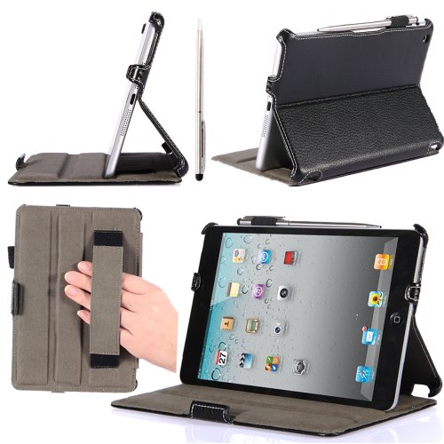 [Description] Designed specifically for Apple iPad Mini/ iPad Mini II 2013 Release The HardBack provides functionality and protection with the all in one design_ folder style case. The HardBack features a stylish and professional looking faux leather exterior Built-in Elastic Hand Strap and Stylus Loop. (Bonus stylus included) Signature built-in Elastic Hand Strap for Secure Grip and Easy Handling Automatically turn on and off (Sleep / Wake) iPad Mini Automatically turn on and off (Sleep / Wake) iPad Mini / iPad Mini with Retina Display / iPad Mini 3 Soft microfiber interior lining offers anti-slip protection when roll back cover is in typing position_ and adds much needed scratch protection for your screen Ports_ buttons_ and camera is perfectly exposed for un-hindered use while your tablet is protected Snap closure to safely secure your device Converts into a multi-angle stand with the groves in the case