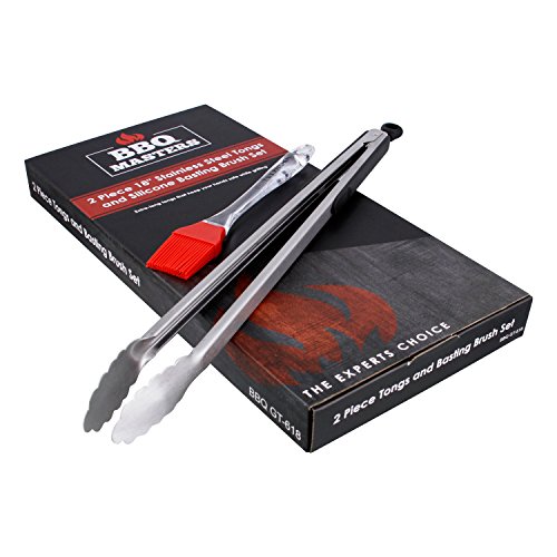 Bbq masters 18" long stainless steel locking tongs and silicone basting brush set - extra long ...