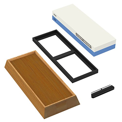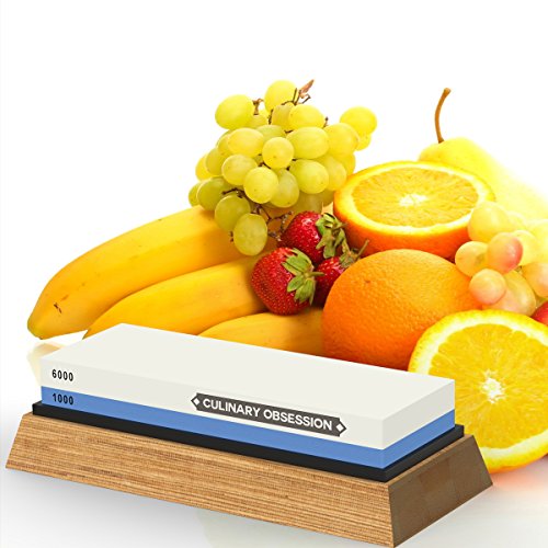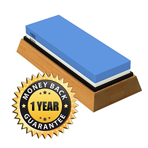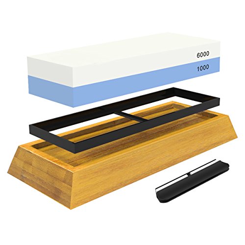 Achieve the Perfect Blade Edge with Two Whetstones in One!Professional Quality Double Sided Knife Sharpening Whetstone with Bamboo Wooden StandMade for a Chef, but easy enough to use for a Home Cook, this is the sharpener system you've been looking for! Perfect for any size knife or other household tool that's a little too dull, our sharpening kit is the boss of all sharpeners! Use the rough #1000-grit side followed by the #6000-grit fine hone polishing side and cutting even the toughest food will feel like slicing through butter. Our perfectly crafted whetstone not only works better than a diamond stone for gouge removal, but is also ideal for scissor sharpening and even honing things like drill bits, dental tools, a nail clipper, ice skates, and of course all sorts of knives, for example fillet knives, paring knives, butcher knives, folding or pocket knives, tactical or survival knives, hunting or buck knives.