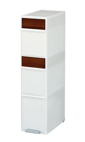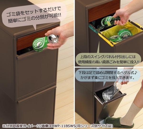 資源ごみをひとまとめにストックできる分別容器3段タイプ☆木目調のスイングパネルがインテリアに馴染むストッカーです。引出し内部の左右の切れ込みにスーパー等の取っ手付きポリ袋をセットするだけで簡単に多種分別が出来ます♪ |