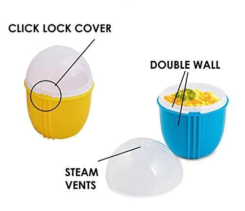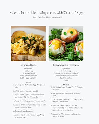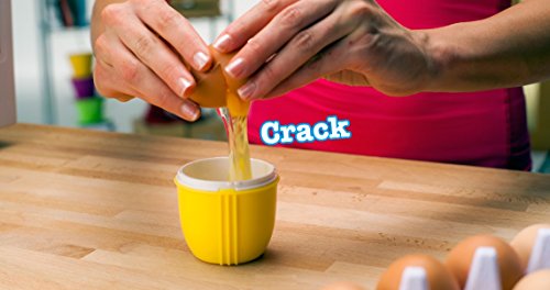 How do I cook my eggs? Cooking eggs with the Zap Chef Cracking' Eggs Microwave Egg Cooker is simple. For a delicious poached egg, just crack one egg into your Cracking' Egg cup, make sure you don't leave any shell and be sure to pierce the egg yolk with a toothpick or something similar. Place the lid on, pop it in the microwave for under a minute and enjoy. It's that quick & easy! No Messy Microwave Splatters! Our egg cooker has a lid lock technology in combination with aeration holes on top of the lid. The lid locks on the bottom all through 1-minute of making your delicious scrambled eggs. Turn the lid on to the bottom it click lock, four air holes on the top release the steam that builds up very quick, making this omelet maker splatter free. Please follow included instructions. Never cook for over a minute! Very Easy to Clean! Is it hot to touch right away? Thanks to double wall design Cracking' Eggs are cool to touch straight out of the microwave, so you don't have to worry about it being too hot to touch and you can eat your eggs as soon as you like. How many eggs will this hold? Each egg cup will hold 1 egg but who doesn't love having two eggs for breakfast? This is why we created a value pack so you can microwave two at the same time. Our egg cups are non-stick and do not melt in the process of being microwave, so your eggs do not come out tasting like plastic. Containers are Non-Stick, BPA Free safe from any chemical getting into your eggs. Great Value for your Money! Choose from a 2 Pack or 4 Pack set. You can get one for all your loved ones. These egg cookers make wonderful gift idea for any occasion; Birthdays, Christmas, Graduations, Father's Day or Mother's Day, Assistant Living, Going Off To College, Camp, Road Trips. Our package comes complete with great instructions and our most famous recipes so you can successfully enjoy this amazing kitchen gadget immediately!Feature
