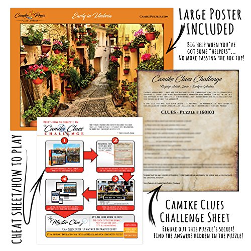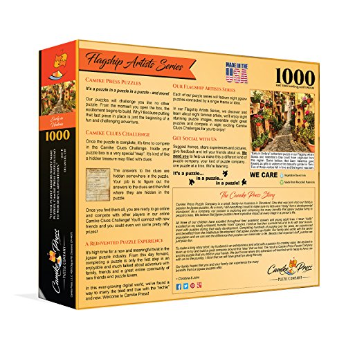 It's a puzzle with an exciting and terrific twist! This 1000 Piece Jigsaw Puzzle by Camike Press Puzzle Company is unlike any you've ever seen. Finishing this beautiful, inspirational puzzle is just the beginning of a wonderful adventure. Once you're done, grab the "treasure map" that came in the box and use it to complete the Camike Clues Challenge (hint: the answers to the clues are hidden IN the puzzle!). When you've found all the answers to the clues, jump on your computer or device and go head-to-head with other puzzle lovers in our online competition. You'll make new friends from around the world-and you could win some AMAZING PRIZES! Our Jigsaw Puzzle is: * Made from high-quality chipboard that resists peeling and delamination * Challenging for children 12 and adults as well as seniors * Comprised of 1,000 pieces that interlock perfectly and stay that way * Entertaining and fun, but also intellectually stimulating * Made in the USA from recycled materials and vegetable-based inks (because we care!) * Ideal as a gift for friends, family, or anyone else who loves a good mind-bender The Camike Press Puzzle Company is a small, family-run business born from our passion for jigsaw puzzles. We believe they can have a positive impact at every stage of life! Ready to discover a fresh, new take on traditional puzzles? Click 'ADD TO CART' to buy now! 0 |