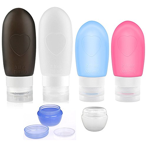 - Set of 4 travel bottles and 2 cream jars, perfect for shampoo, conditioner, lotion, body wash, face wash, or sunblock. BPA free and Food safe soft silicone material, usable for lunchbox for salad dressing, ketchup/mustard etc.