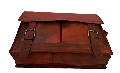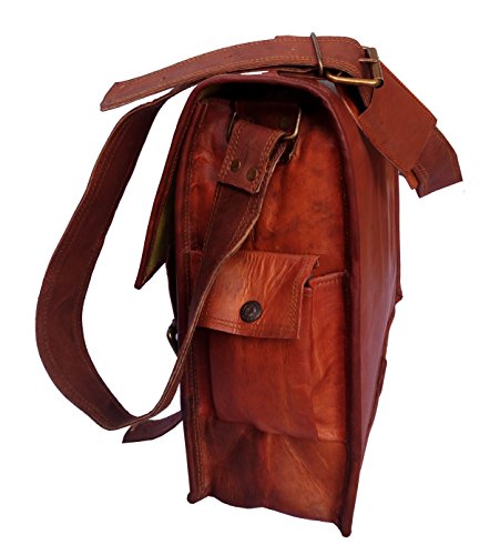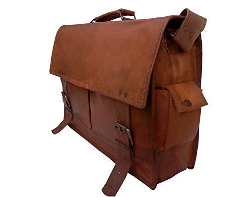 -. Feature : Naturally Processed Leather Which Is Chemical Less, Non-Allergic and Eco Friendly / Brass/ Metal Fitting Buckles and Holders and Internally Lined with Strong Green Canvas Make it Durable and Long Lasting / Vintage Leather Bag. It Is Handcrafted Using Pure 100% Genuine Goat Leather. / Dimension - (WxHxD) - 17 x 12 x 5 inches / 2 Front Pocket, 3 Inner compartments, 2 Zipper Pockets, Long and adjustable Shoulder Straps