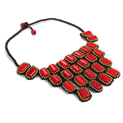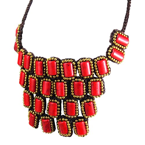 This divine statement piece features reconstructed red coral in a mosaic droplet bib-style design. Crafted by hand, this necklace showcases an intricate matrix of crocheted and cotton wax rope strands. PLEASE NOTE: The handcrafted nature of this product will produce minor differences in design, sizing and weight. Variations will occur from piece to piece, measurements may vary slightly.Includes an original AERAVIDA organza jewelry pouch (comes in various colors), also handmade by our Artisans. Perfect for gift giving to someone special or keep for yourself!