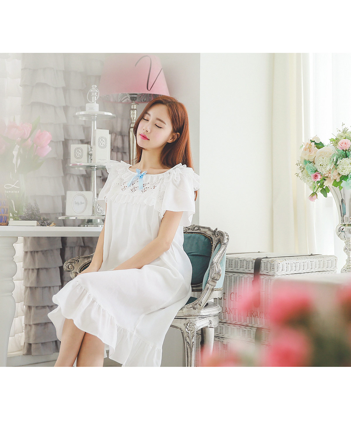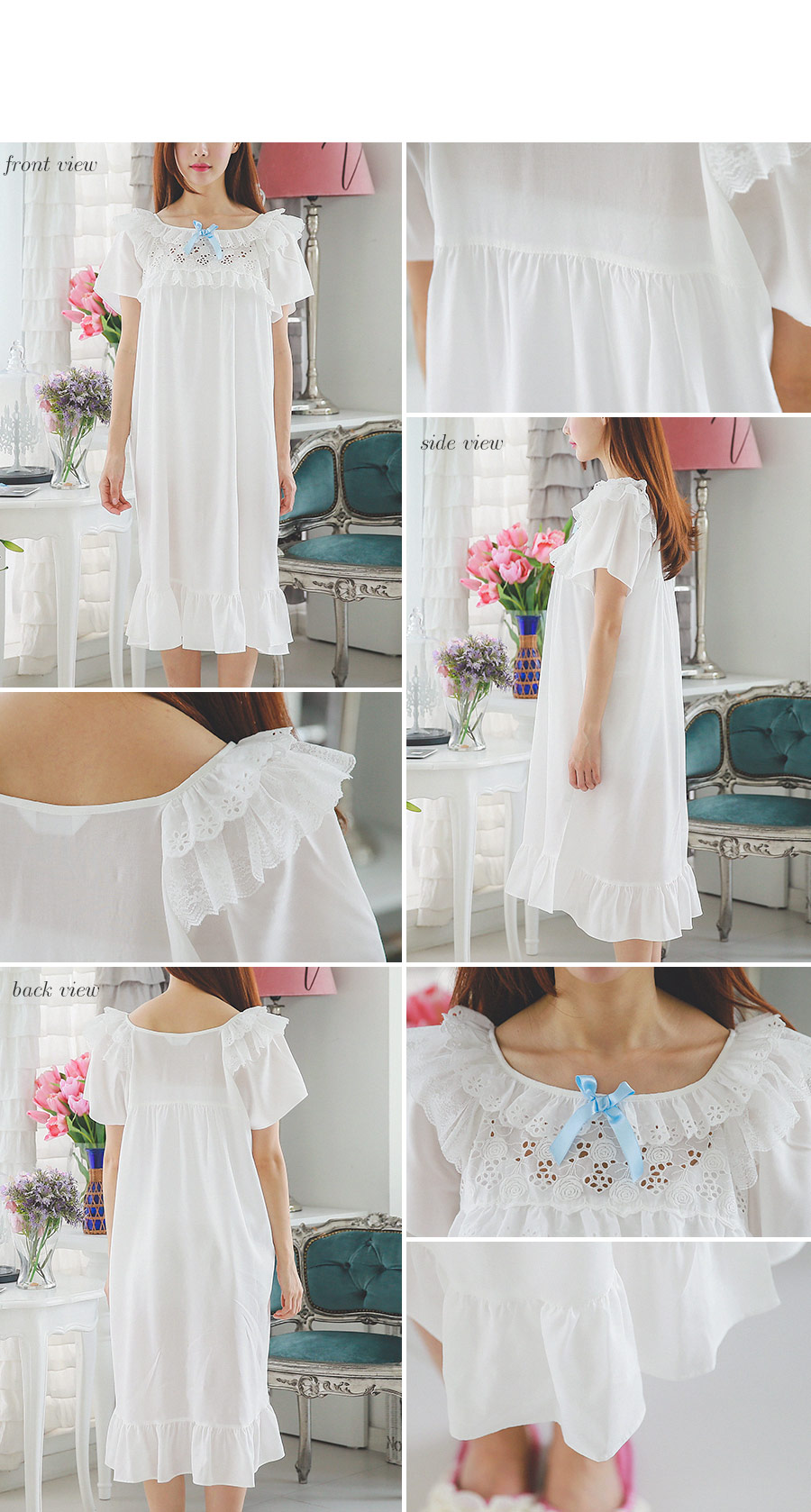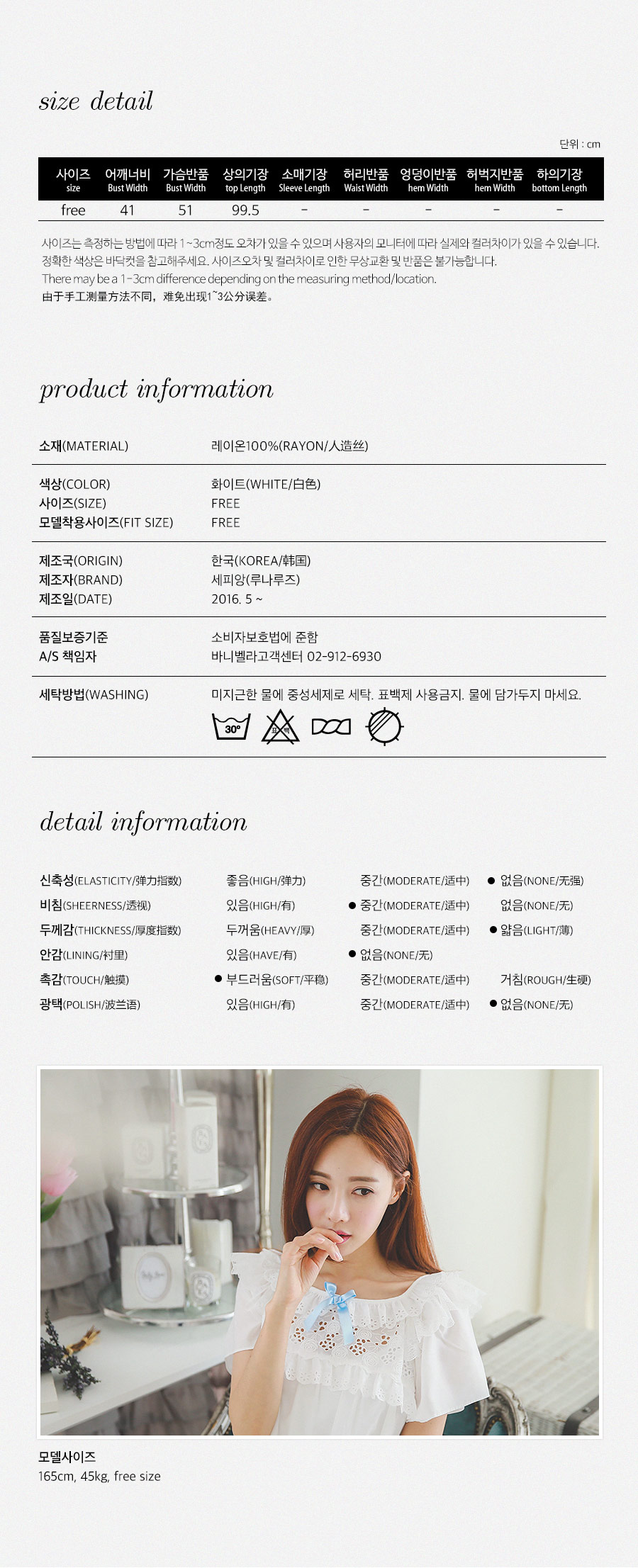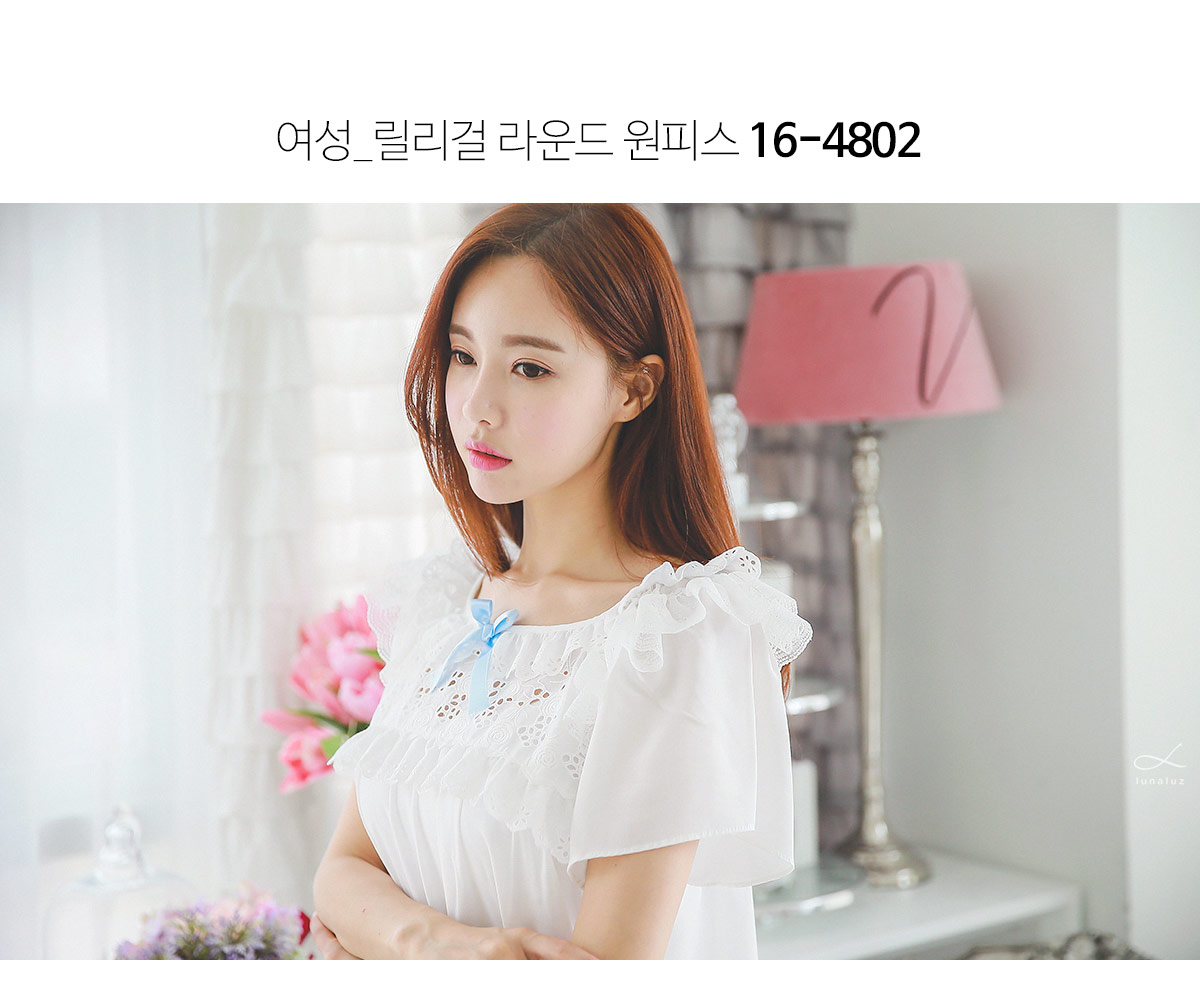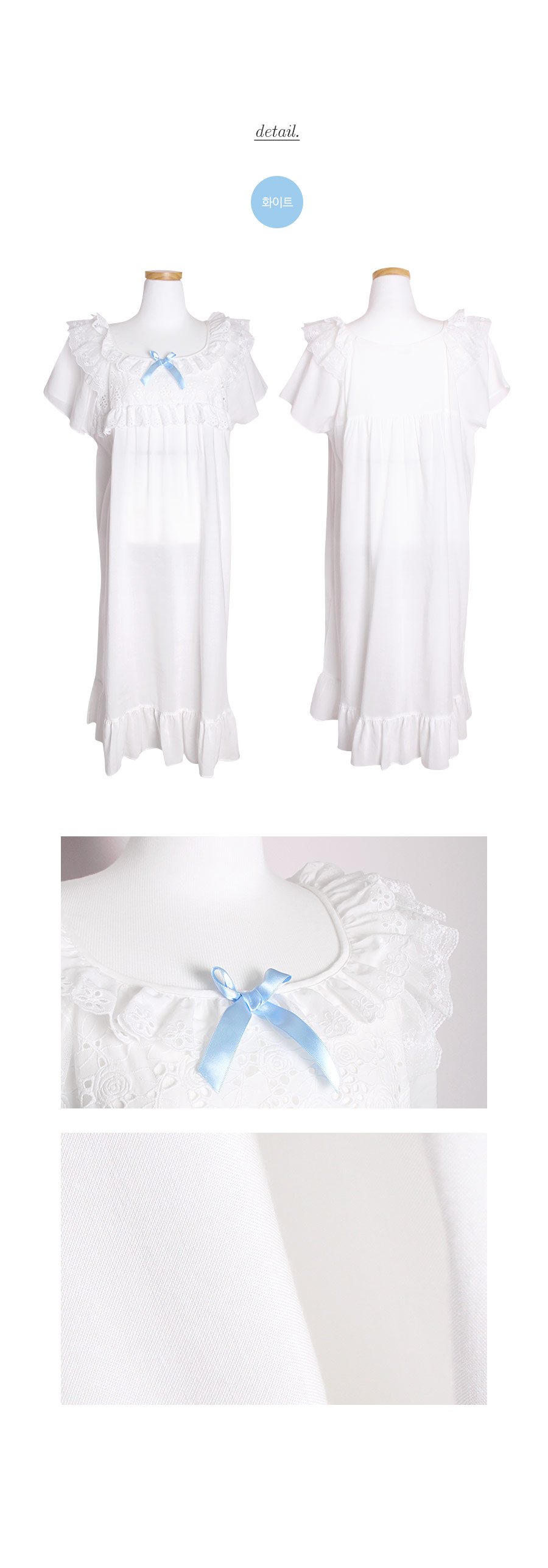 여리한 스퀘어 네크 라인이 쇄골 라인을 내어주며 날씬해 보이면서 여성스러운 느낌을 자아내는데요. 저희 기존 사브리나 패턴을 응용하여 어깨선이 없는 래글런 패턴의 반소매 잠옷으로 제작해 보았어요. 네크 라인에 화이트 면 레이스 장식을 달아주고 바스트 윗 부분에도 레이스 장식을 달아주어 사랑스러움을 더해주었고요. 쉬폰 망사 레이스를 네크의 면 레이스 밑으로 2중으로 달아주어 고급스러운 분위기를 연출하실 수 있어요 : ) 가슴 부분에 오로바 면 레이스를 넓게 달아주어 포인트를 주었습니다. 고급스러우면서 깨끗한 느낌을 주는 잠옷으로 청순하면서 페미닌한 분위기를 느끼실 수 있을 거에요. 가운데에는 블루 컬러의 리본을 달아주어 화사한 분위기를 더욱 UP해주었습니다. 원단은 레이온 원단으로 제작하여 피부에 닿는 느낌이 시원하고, 상쾌 하여 숙면을 취하시기 좋습니다.^^ 낙낙한 품으로 제작하여 66 반까지 커버 가능합니다.^^ 레이온의 찰랑거림 보다는 면 같은 느낌이지만 cool한 느낌이 감도는 잠옷으로 활용도가 좋아요~ 컬러는 청순해보이는 화이트 컬러, 시원해보이는 소라색 컬러로 구성해 보았습니다. 100% 국내 제작으로 내구성은 높여주고, 퀄리티 있는 원단으로 초이스 하여 제작한 잠옷입니다.^^