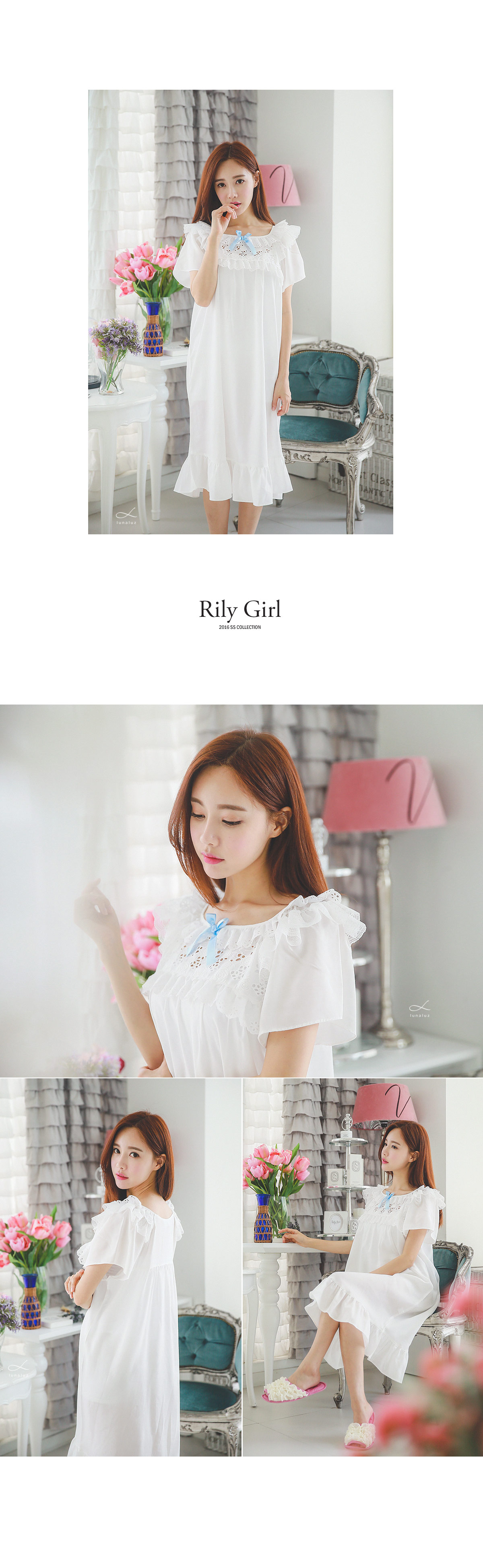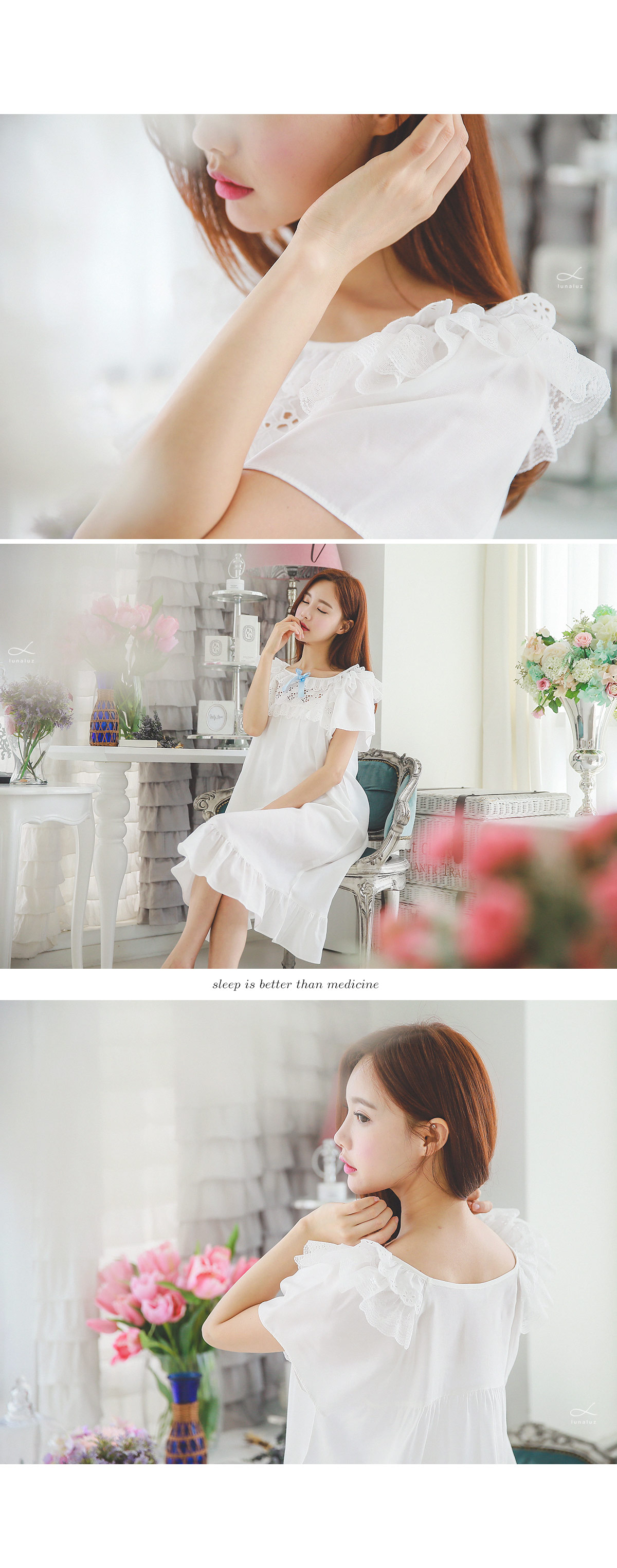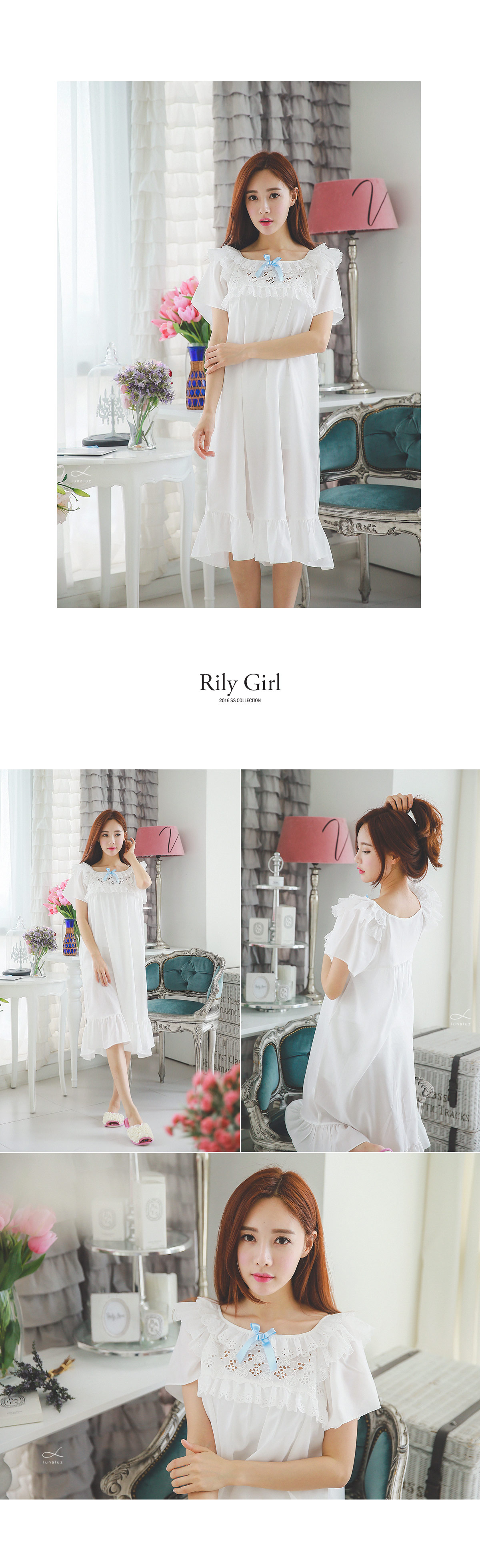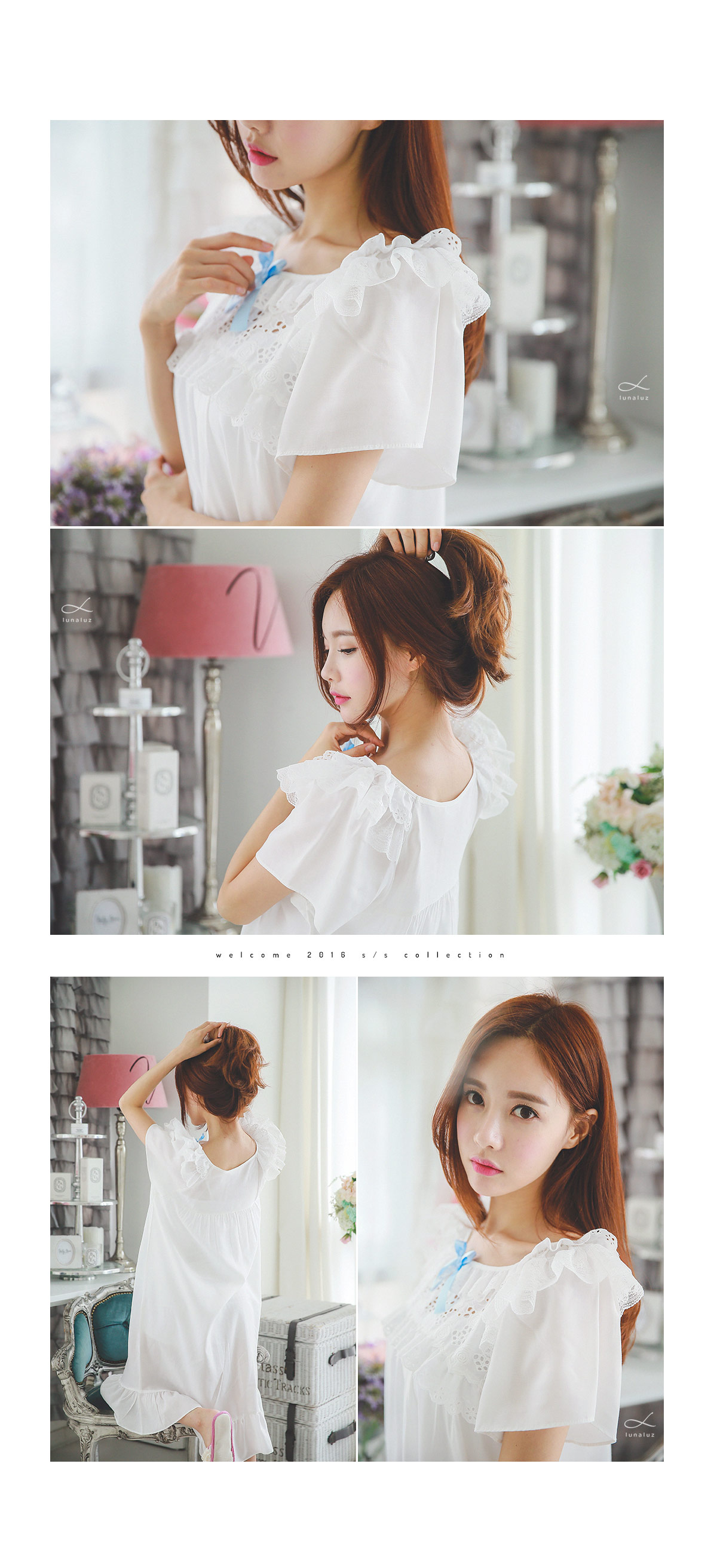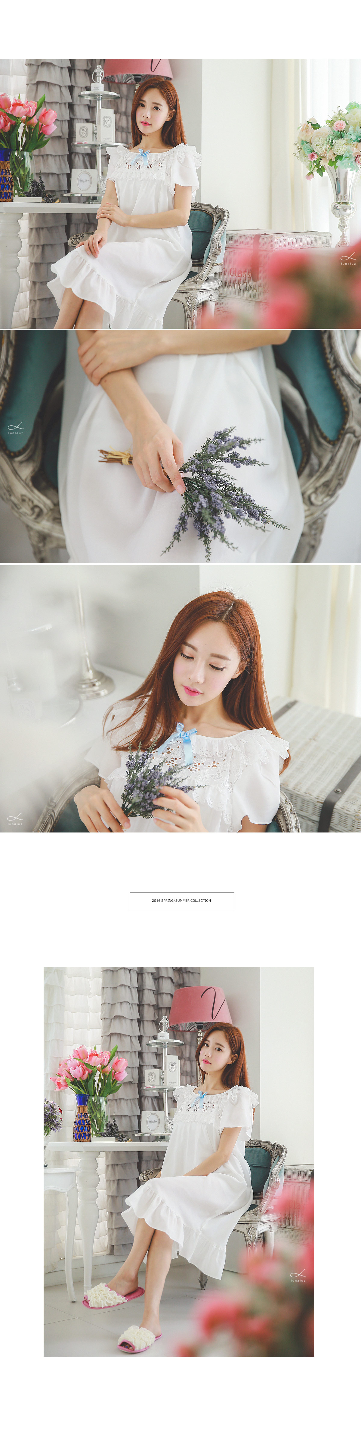 여리한 스퀘어 네크 라인이 쇄골 라인을 내어주며 날씬해 보이면서 여성스러운 느낌을 자아내는데요. 저희 기존 사브리나 패턴을 응용하여 어깨선이 없는 래글런 패턴의 반소매 잠옷으로 제작해 보았어요. 네크 라인에 화이트 면 레이스 장식을 달아주고 바스트 윗 부분에도 레이스 장식을 달아주어 사랑스러움을 더해주었고요. 쉬폰 망사 레이스를 네크의 면 레이스 밑으로 2중으로 달아주어 고급스러운 분위기를 연출하실 수 있어요 : ) 가슴 부분에 오로바 면 레이스를 넓게 달아주어 포인트를 주었습니다. 고급스러우면서 깨끗한 느낌을 주는 잠옷으로 청순하면서 페미닌한 분위기를 느끼실 수 있을 거에요. 가운데에는 블루 컬러의 리본을 달아주어 화사한 분위기를 더욱 UP해주었습니다. 원단은 레이온 원단으로 제작하여 피부에 닿는 느낌이 시원하고, 상쾌 하여 숙면을 취하시기 좋습니다.^^ 낙낙한 품으로 제작하여 66 반까지 커버 가능합니다.^^ 레이온의 찰랑거림 보다는 면 같은 느낌이지만 cool한 느낌이 감도는 잠옷으로 활용도가 좋아요~ 컬러는 청순해보이는 화이트 컬러, 시원해보이는 소라색 컬러로 구성해 보았습니다. 100% 국내 제작으로 내구성은 높여주고, 퀄리티 있는 원단으로 초이스 하여 제작한 잠옷입니다.^^