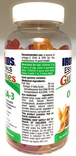 IronKids award winning Omega-3 gummies are Canada's #1 omega for kids.;They are specially formulated with pure source DHA and EPA,;This product contains: fish oil (tuna), soybean oil.;Children 2 to 4 years of age - chew 4 gummies daily. Adults and children 4 years of age and older - chew 4 gummies 1 to 3 times daily.;PRODUCT OF CANADA