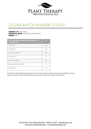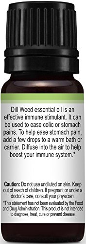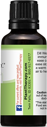 -. Feature : Botanical Name: Anethum graveolens / Aromatic Scent: Dill Weed Essential Oil has a fresh, herbaceous scent that is gentle, warm and spicy / 100% Certified Pure, Therapeutic Grade Essential Oil- no fillers, additives, bases or carriers added / Have Questions? Message one of our Certified Aromatherapist through Amazon messages / At Plant Therapy we also have some other selections you may be interested in. Includes: Basil, Bergamot, Cajeput, Carrot, Cedarwood, Chamomile, Cinnamon, Citronella, Clary Sage, Clove, Cypress, Eucalyptus, Fir, Frankincense, Garlic, Germanium, Ginger, Grapefruit, Helichrysum, Lavender, Lemon, Lime, Mandarin, Marjoram, Myrrh, Neroli, Naiouli, Nutmeg, Orange, Oregano, Patchouli, Peppermint, Pine, Rosemary, Spearmint, Tangerine, Tea Tree, Thyme, Vetiver, Vanilla, Wintergreen, Ylang Ylang.