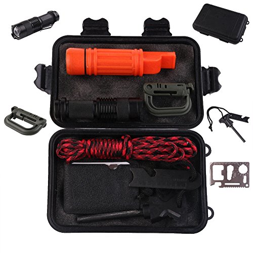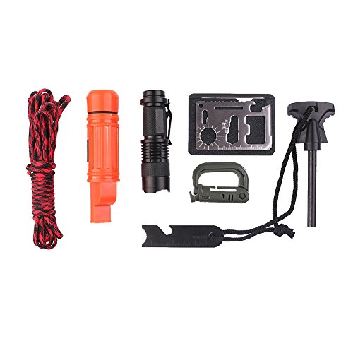 - 🔧 Ultimate Multifunction Wilderness Survival Kit Set contains : flashlight, compass, whistle, fire starter, multi-tool card, survival bracelets and so on even fishing tools, all you needs to help survive, outdoor essential goods