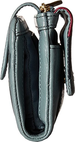 Measurements: 5.38"l x 1.5"w x 4"h; interior features: 2 bill compartments, 12 credit card slots, 1 id window and 1 zipper pocket, under flap: 1 slide pocket; exterior features: 1 top zipper pocket