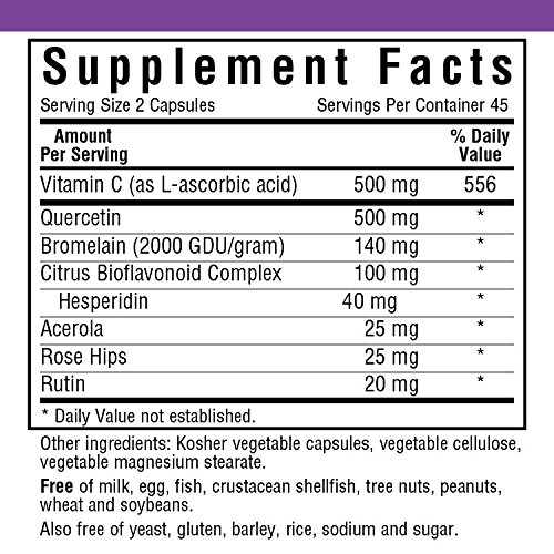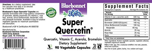 Bluebonnet's super quercetin vitamin capsules provide a potent combination of antioxidants and allergy-supporting natural ingredients, including 500 mg of quercetin, 500 mg of vitamin c from pure l-ascorbic acid, rose hips, acerola, rutin, citrus bioflavonoids (such as hesperidin) and pineapple bromelain. Available in easy-to-swallow vegetable capsules for maximum assimilation and absorption. Quercetin is used for treating conditions of the heart and blood vessels. It also has antioxidant and anti-inflammatory effects which might help reduce prostate inflammation.Feature