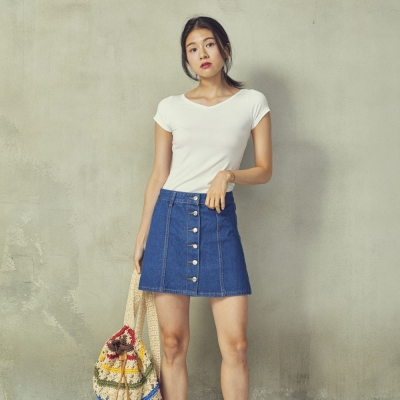 버튼 블루 스커트