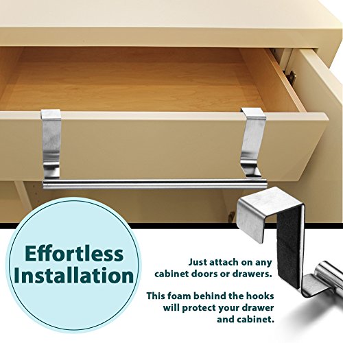 EFFORTLESS INSTALLATION ON ANY CABINET DOORS - Just attach the kitchen towel rack to any standard cabinet door or drawer. The non-absorbent foam on the back of the hook will protect your cabinet.