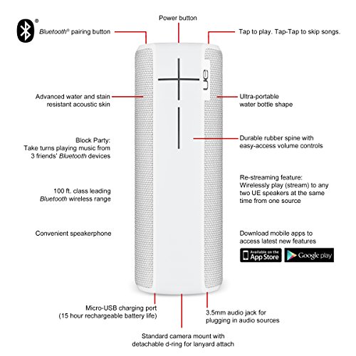 UE BOOM 2 is the 360-degree wireless speaker that blasts loud, insanely great sound with deep, powerful bass in every direction–everywhere you go. It was designed to get wet, muddy, and beat up. PartyUp allows you to wirelessly connect to up to 50 Ultimate Ears speakers and takes your party where no other sound system can go. Caves. Mountains. Lakes. Rooftops. You name it. It's waterproof*, shockproof and crafted from the sexiest and most uninhibited premium materials in the known universe. And with Siri + Google Now voice integration***, you just open your mouth and use your words — so instead of reaching for your phone, you can pick up UE BOOM 2 so nothing comes between you and the music. *IPX7-rated waterproof (up to 30 minutes and a depth of 1 meter). ** Requires latest firmware & software update.