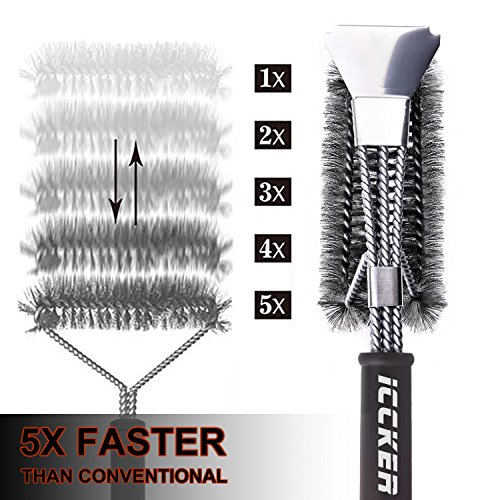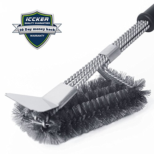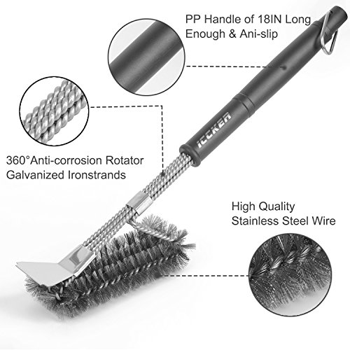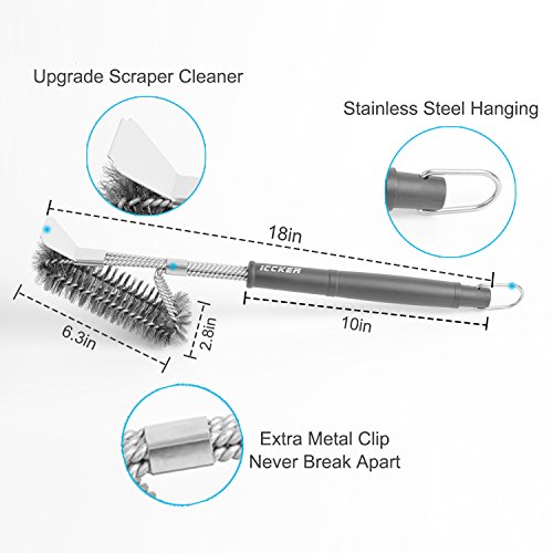 - ★Produced by Italian equipment,built with strong stainless steel, not easy to loose wire like others.★With Scraper Strong Clean Grease - ICCKER BBQ grill brush with scraper can clean stubborn stains deeply and efficiently. Easily Removes Food, Grease, and Debris from all type of Grill Grates without Scratching or Damaging the Surface