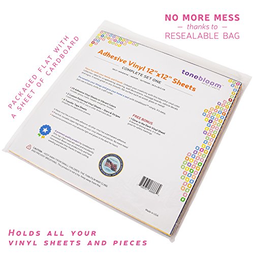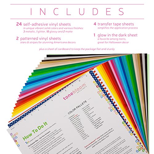 Self Adhesive Vinyl Sheets 12"x12" - Made in USA by Tonebloom - Permanent, 24 Colors, Transfer Paper, Patterns, Glow in the Dark - for Cricut, Silhouette Cameo Craft Cutters - for Decals Signs