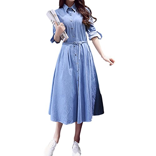 -. Title : ELPIS レディース デニムワンピース ロング丈 長袖 フレア 膝下 腰ベルト スカート 襟つき