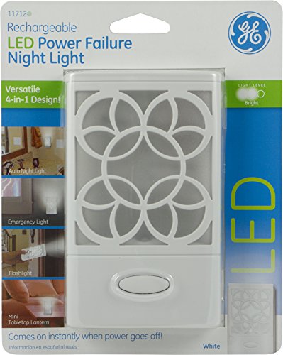Be ready with emergency lighting with the GE Rechargeable LED Power Failure Night Light. This night light is really four products in one -- portable flashlight, night light, emergency light, and mini tabletop lantern. During regular use, this innovative LED night light emits a bright glow on an area like a decorative light sconce. During a power outage, it instantly comes on and can be used as a portable flashlight. Simply remove it from the wall. It also acts as a mini lantern you can sit out on your tabletop or counter. This night light includes a light sensor which turns it on at dusk and off at dawn. While plugged in, it is recharging in case of power outage. It also features a retractable plug for easy storage when not in use. It is intended for indoor use only. This product comes with a limited lifetime warranty.Feature