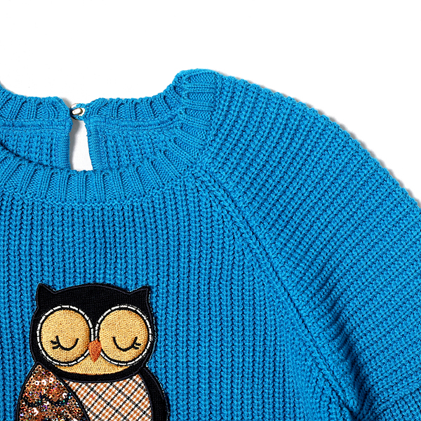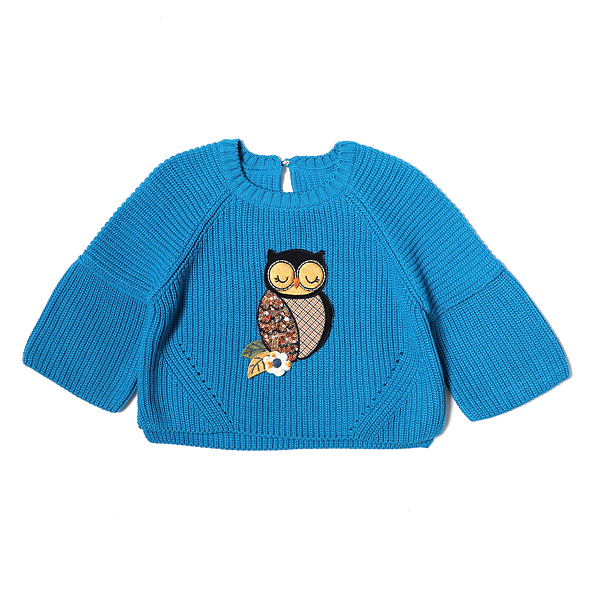 소재-겉감 : 아크릴 65 면 35색상-블루 사이즈-110,120,130,145,155,165상세설명-앞쪽에 큰 부엉이 스팽글 장식으로 포인트를 준 망또형 니트입니다. 소매 부리쪽을 넓게 하여 스타일리쉬해 보이며