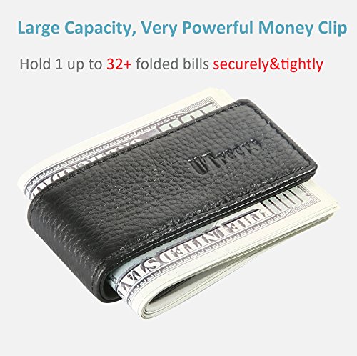 Large Capacity, Very powerful money clip Works perfectly, nice strong magnets: money clip has a very strong magnet, can hold more than More than 32 bills. Strong magnet will hold only a single bill or many. Holds money and receipts securely tightly. Looks classy and good stitching. Money receipts well organized