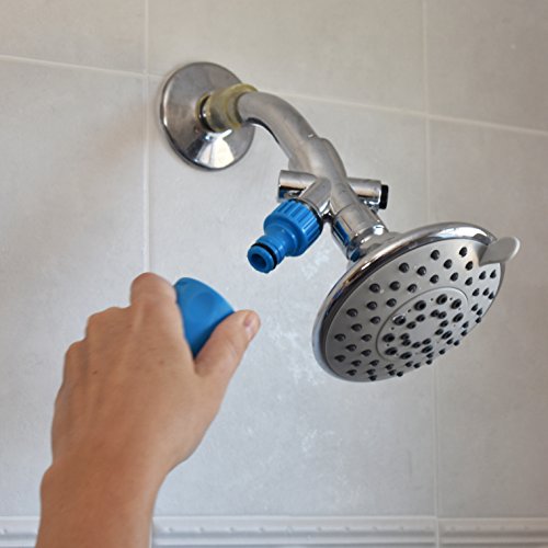Includes adapters for connecting to shower bath tub and outdoor garden hose