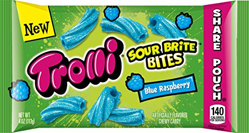 -. Binding : Grocery -. Brand : Trolli -. EAN : 0041420580000 -. Feature : With just the perfect amount of sour, these blue raspberry treats will keep you coming back for more / Gummy candy dusted with the perfect amount of sour sugar to leave a pleasant tang in your mouth / Delicious blue raspberry flavored bits / Want to watch a magic trick? Put these sour tubes on your coffee table or desk and watch them disappear in minutes / From the creators of America's best selling gummy worm -. Label : Ferrara Pan Candy Co. -. Manufacturer : Ferrara Pan Candy Co. -. NumberOfItems : 1 -. PackageQuantity : 1 -. ProductGroup : Grocery -. ProductTypeName : GROCERY -. PublicationDate : 2016-09-01 -. Publisher : Ferrara Pan Candy Co. -. ReleaseDate : 2016-09-01 -. Size : 4 Ounce Bag, Pack of 12 -. Studio : Ferrara Pan Candy Co. -. Title : Trolli Sour Brite Bites Candy, Blue Raspberry, Pack of 12 -. UPC : 041420580000