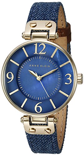 Gold-tone watch featuring blue mother-of-pearl dial with stick and Arabic numeral markers