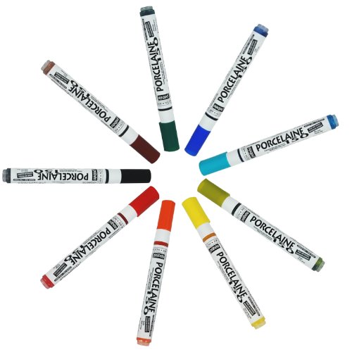 With Porcelaine 150, you don't have to be a professional artist or even own a kiln, your kitchen oven is all that you need. Easy to use, Porcelaine 150 markers let you redecorate your household china in bright, cheerful colours. Turn cool summer china into warm winter painted pieces to brighten up your home. The range of Porcelaine 150 markers includes 19 brilliant and intense colors declined in 10 bullet tip markers and 9 fine tip markers for use on china, porcelain, tile, metal, ceramic, glass and more! This boxed set set includes 9 bullet tip assorted colors which are ideal for outlining, tracing, drawing, writing and personalizing surfaces. these markers are the perfect tool for those not comfortable using a brush and for children. They allow for coloring in of small to medium sized designs on the piece. The rest of the line includes 46 brilliant, intense colors including 35 standard colors, 10 Shimmer colors and 10 outliners. Colors are water based and non-toxic. Conforms to ASTM D-4236.Feature